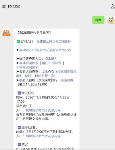 | 厦门 | 福建省公务员考试笔试成绩查询 | 2026年4月上旬 | 点击查询 |