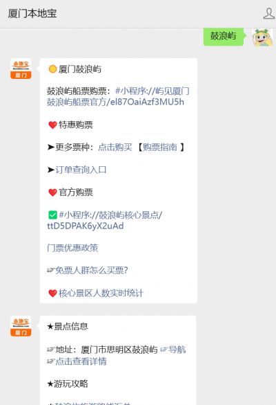 温馨提示:微信搜索并关注【厦门本地宝】公众号,在对话框回复【鼓浪屿】即可获取鼓浪屿景点特惠购票入口、门票价格+优惠政策、游玩路线攻略、最新活动资讯、船票购买入口等!